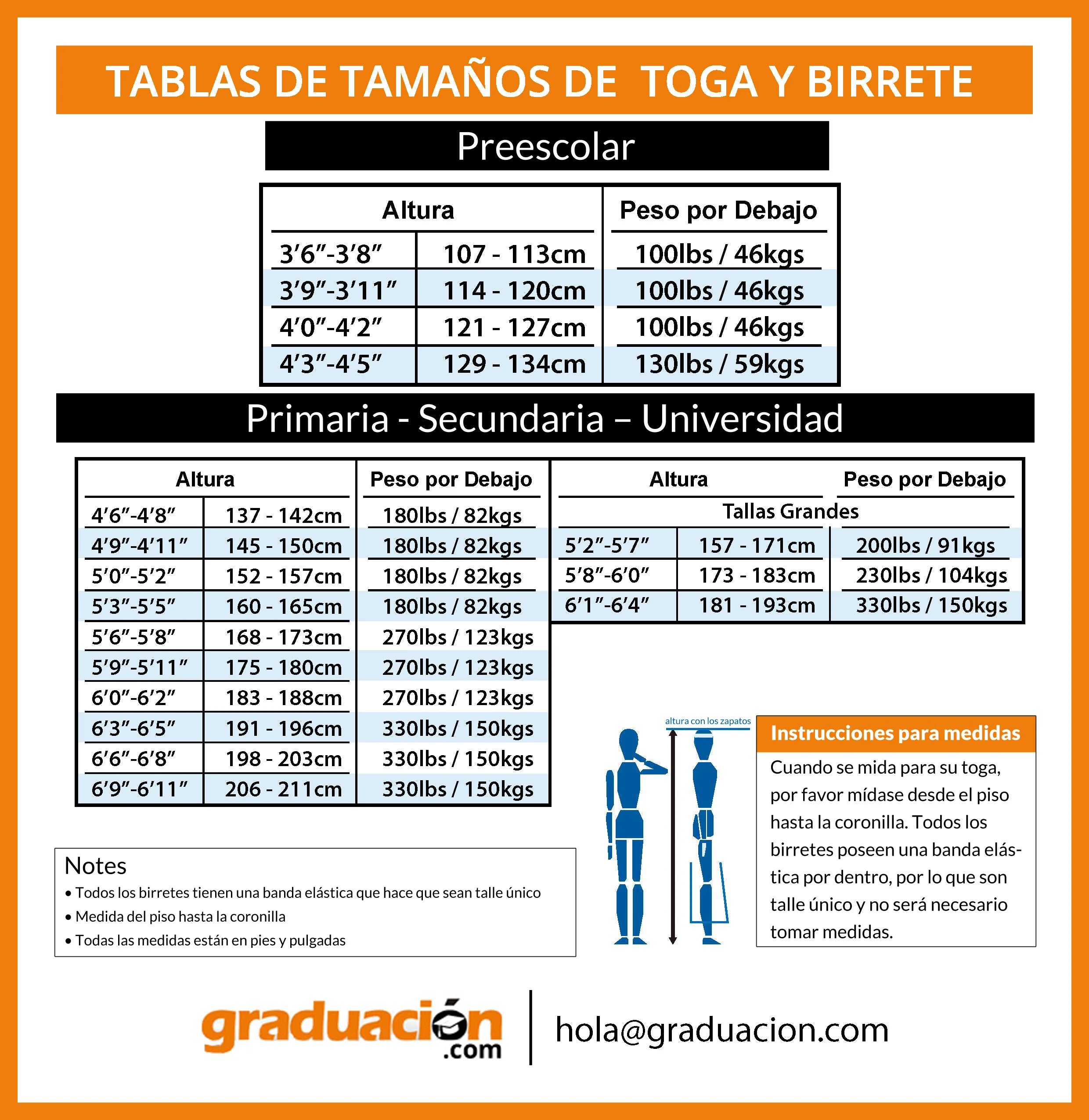 Encuentre la talla correcta para su toga. Vea las instrucciones en la parte de abajo.