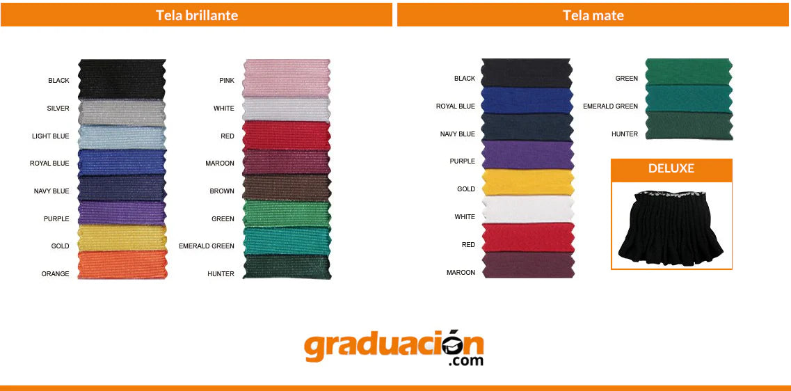 Birrete, toga y borla de lujo para graduación de maestría .Una de las mejores cosas que puede conseguir después de muchos años de duro trabajo académico es recompensarse con un conjunto de calidad para la celebración de su graduación. En Graduacion.com sabemos de la importancia de esta ceremonia y, por ello, le asistimos con un vestuario que combina a la perfección cultura, moda y prestigio. Cada una de nuestras togas ha sido meticulosamente fabricada con pliegues frontales hermosos, birretes ajustables a cualquier tamaño y borlas que proporcionan el final perfecto. Tenemos el paquete perfecto para su graduación y le ofrecemos la posibilidad de adquirirlo a precios sorprendentemente bajos. Haga su pedido de forma fácil en línea o a través de fax. No hay tiempo que perder, ¡póngase en contacto con nosotros hoy mismo!